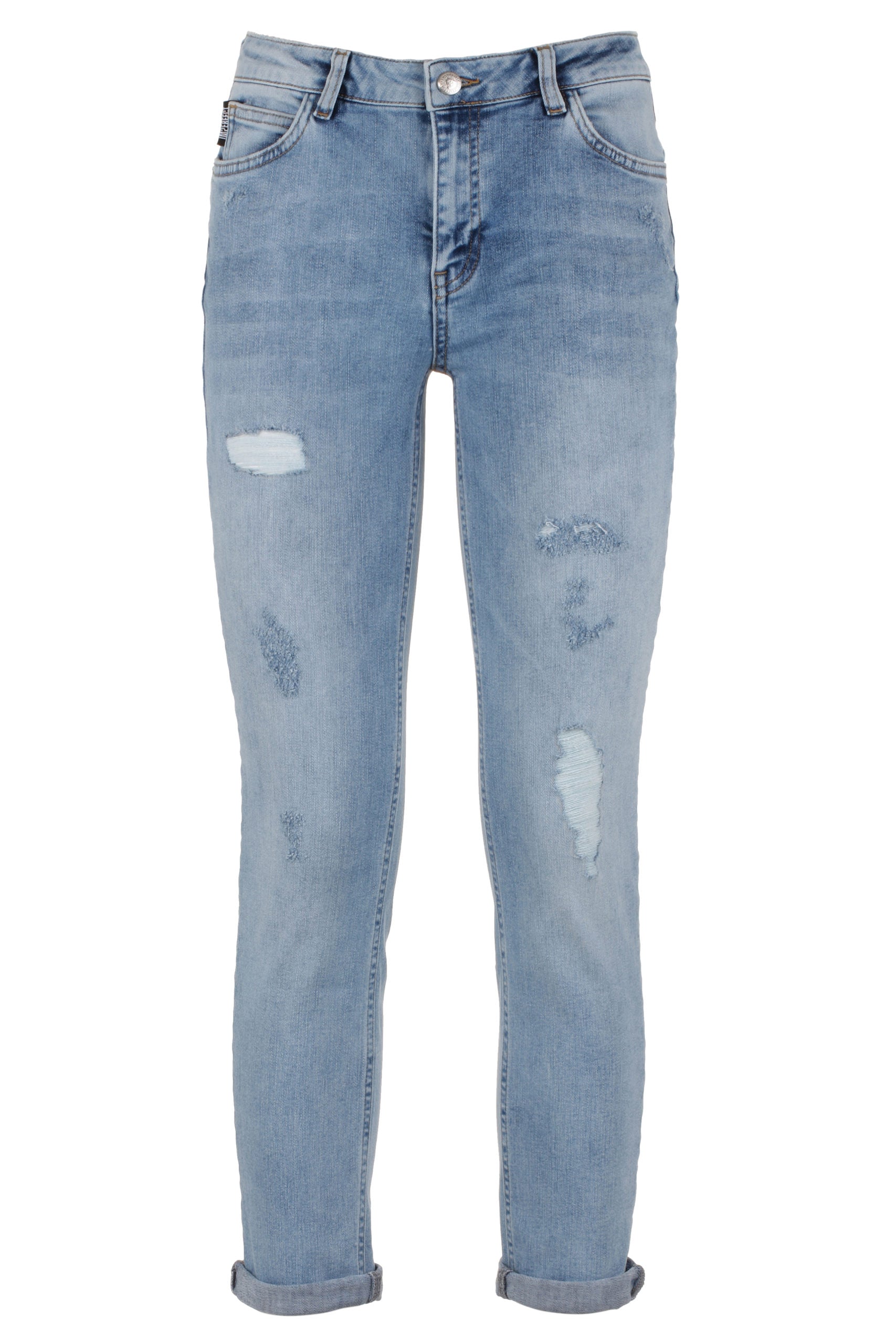 Imperfect denim, blue color, cotton made and elasticized.